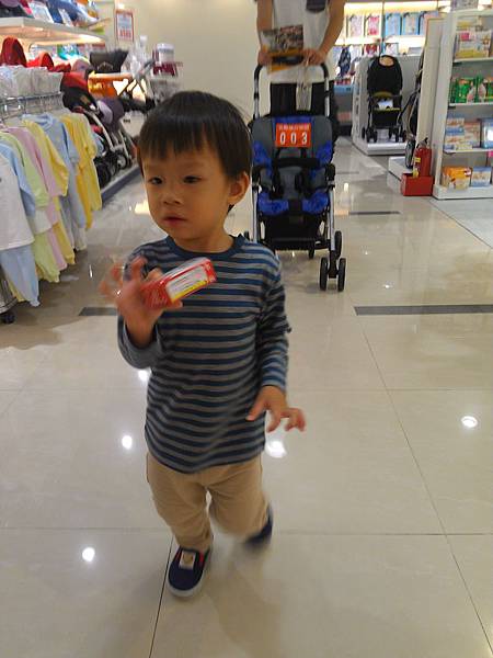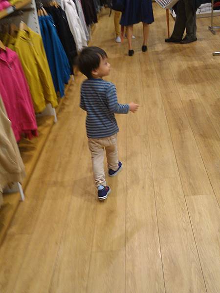 到了uniqlo小屁孩一直延著這些衣服走來走去,