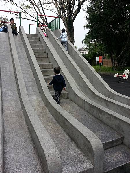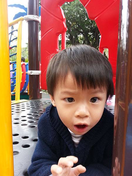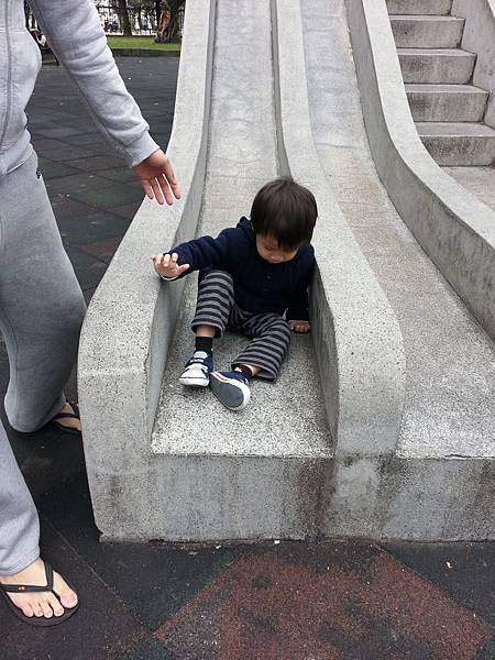 但玩他喜歡的溜滑梯時還是很開心