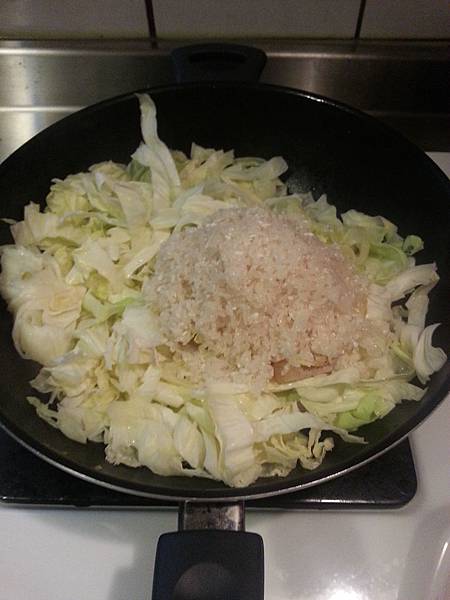 然後將高麗菜跟生的米一起放入鍋中...