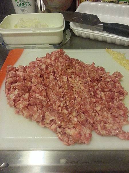 把豬肉末再切碎一點~