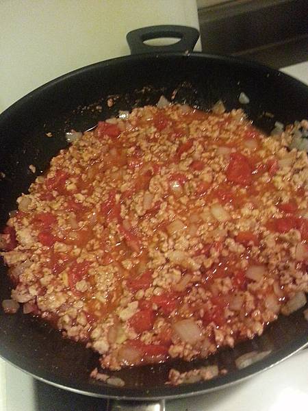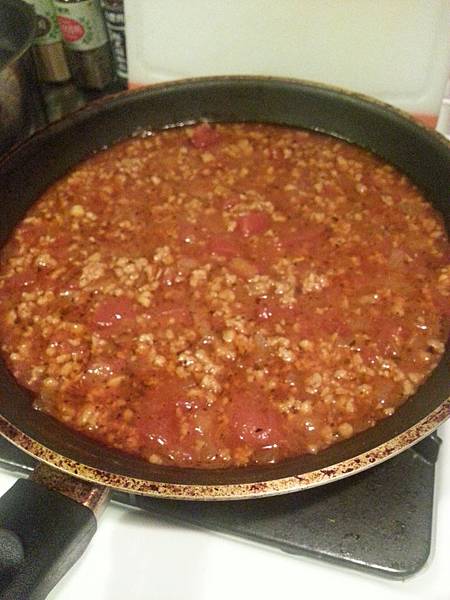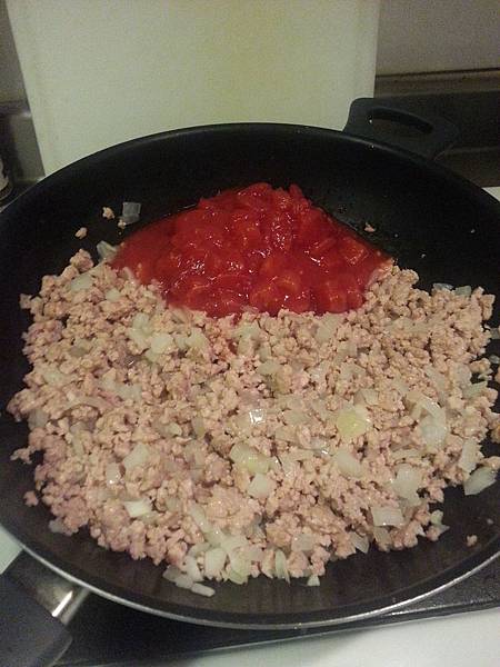 然後再拿一個平底鍋放入適當的義大利肉醬,