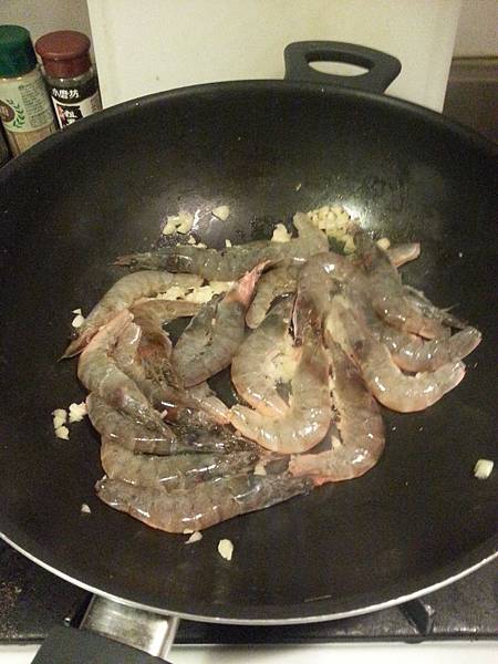 作法先將蒜末爆香~然後放入蝦子拌炒至蝦子變紅