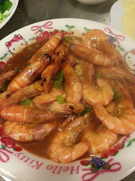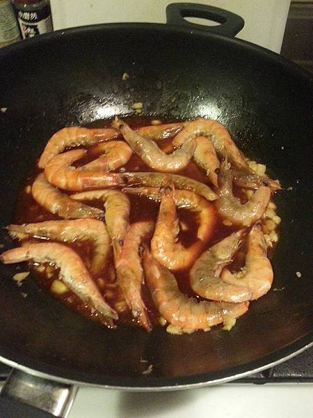 然後再把所有的調味料放下去跟蝦子一起拌炒至入味即可~~