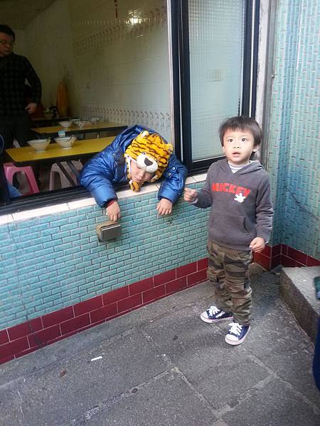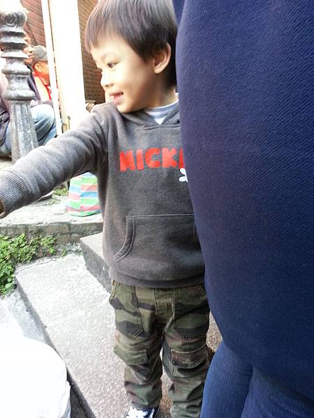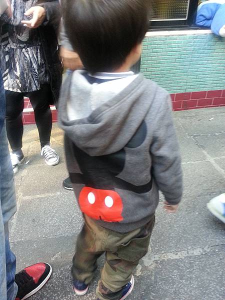 排隊時小屁孩看到一個小哥哥頭上戴著老虎的頭飾,