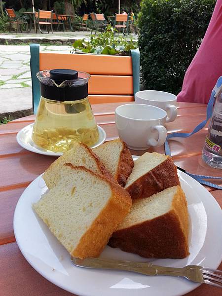 我們用了門票的抵用卷來買了一壺花茶跟農場自己烤的蛋糕~
