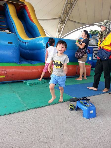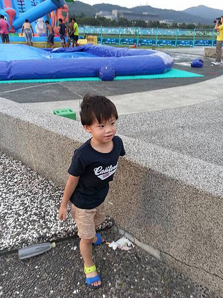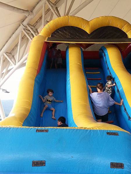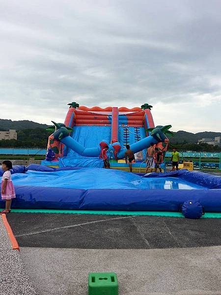 好玩的東西好多!有好幾座大型的充氣遊戲墊、又可以玩水、玩沙、玩溜滑梯、騎腳踏車~